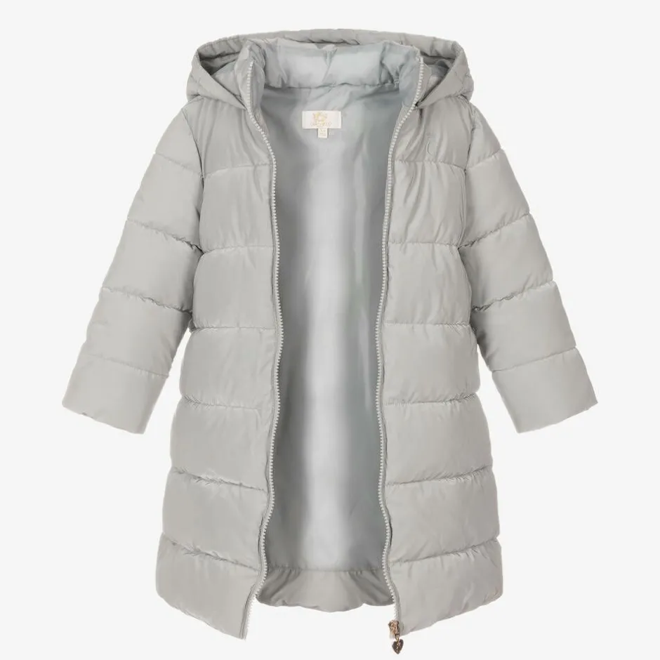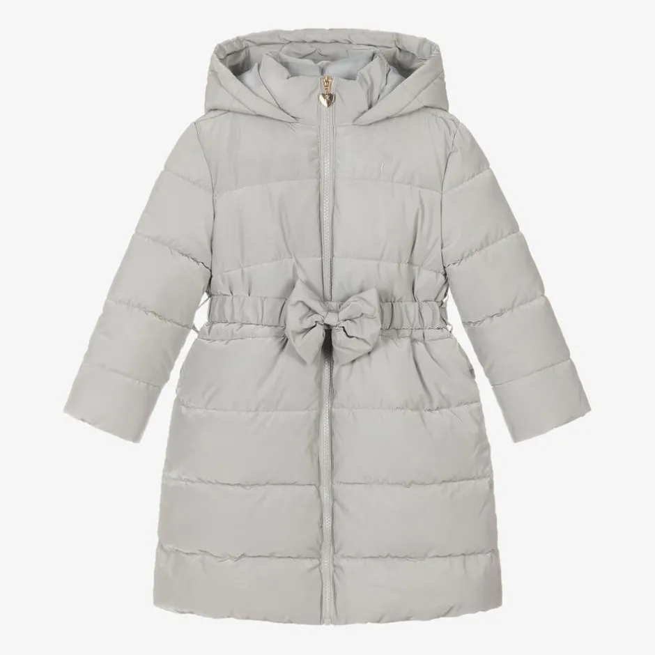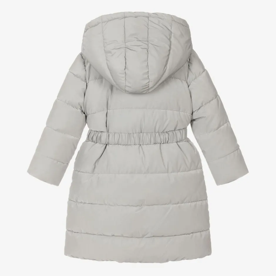 Soft and smooth, grey hooded puffer coat for girls by Caramelo Kids. Ideal for the cooler weather, it has warm mid-weight padding and a silky lining for added comfort. It is embroidered with a tonal branded detail on the chest and has a heart-shaped logo-engraved pull on the front zip fastening. An elasticated popper-fastened belt with a pretty bow detail creates a cinched waist and there are useful pockets hidden in the side seams.