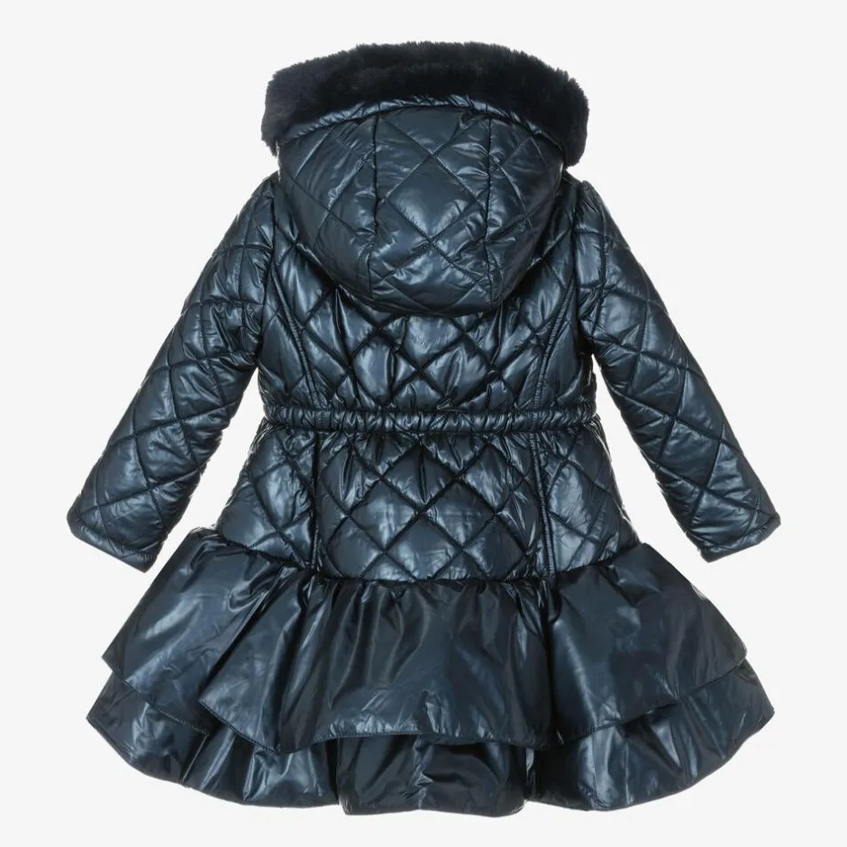 Designed with a metallic sheen, this gorgeous navy blue coat for girls by Caramelo Kids, has a fixed hood with a cosy faux fur lining and trim. Made in a smooth, quilted fabric, it is styled with a layered, frilled hemline and a partially elasticated waistband for shape. It is trimmed with ruffles and decorative bows and features internal ribbed cuffs and useful pockets, which secure with gold-tone branded poppers. A gold zip fastening on the front completes the stylish look.