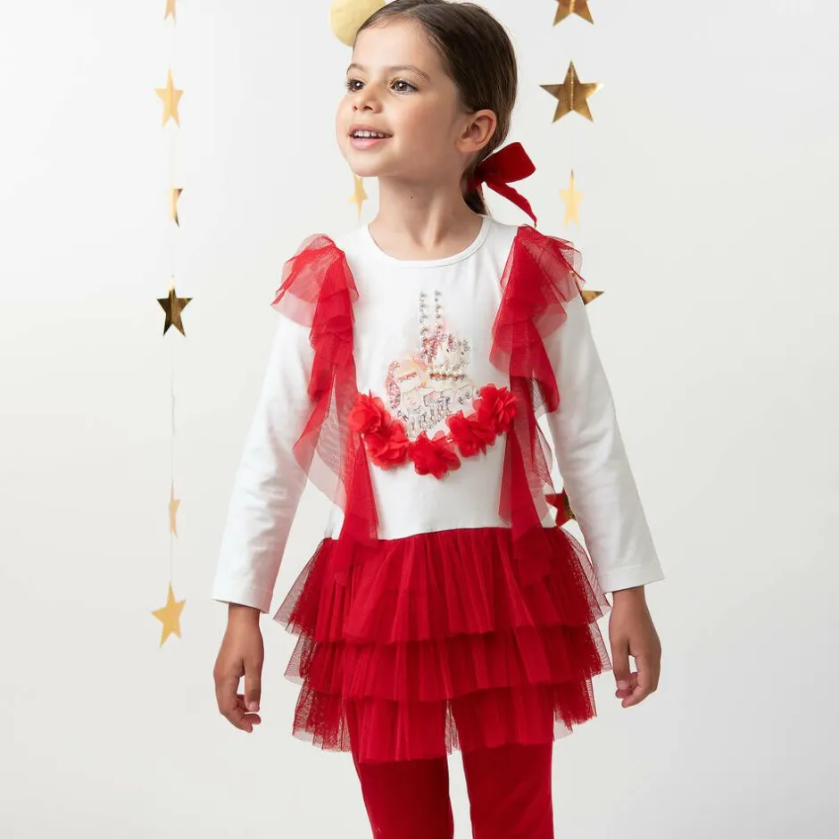 Red and white leggings set for girls by Caramelo Kids, made in soft cotton jersey. The white top is trimmed with red tulle ruffles and 3D flowers and has a layered tulle hem. The front features a lovely pastel print of carousel horses decorated with pearl beads and shiny diamantés. The red leggings have pretty bows on the ankles and a comfortable elasticated waistband.