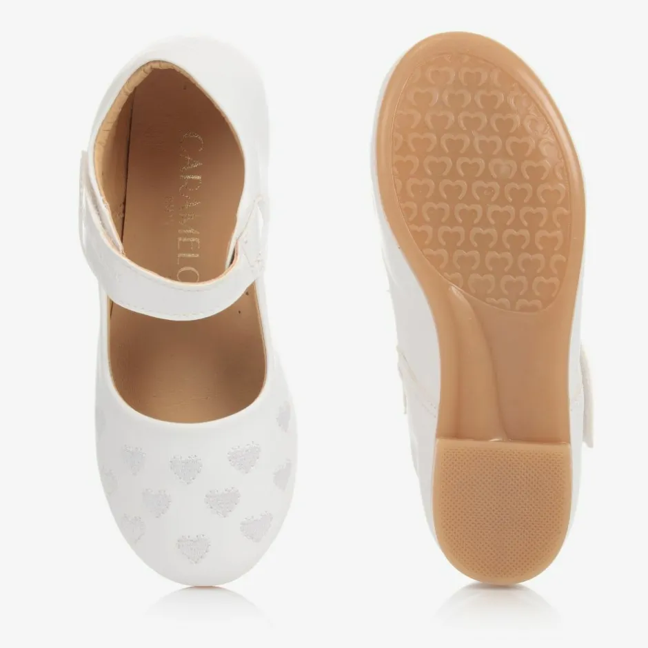Girls white smart shoes by Caramelo Kids. They are made in smooth faux leather with embroidered hearts across the toes. They have a velcro foot strap decorated with a big bow and gold heart badge. They are lined in leather and have a padded instep. They have a soft rubber outer sole, with non-slip pads and a small heel.
