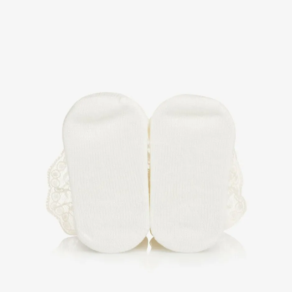 Ivory socks for baby girls by Spanish brand Carlomagno, with pretty frilly lace trims. Comfortable on tiny feet, they are made in a soft and stretchy cotton blend.