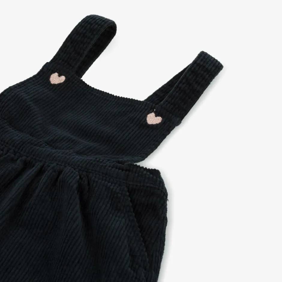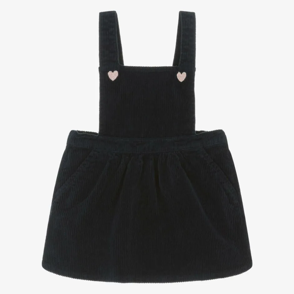 A cute navy blue pinafore dress for little girls by Carrément Beau, made in beautifully soft cotton corduroy. The bib front has sweet embroidered hearts on each side and adjustable shoulder straps for a good fit. Gently elasticated at the waist, the full skirt has sweet front pockets.