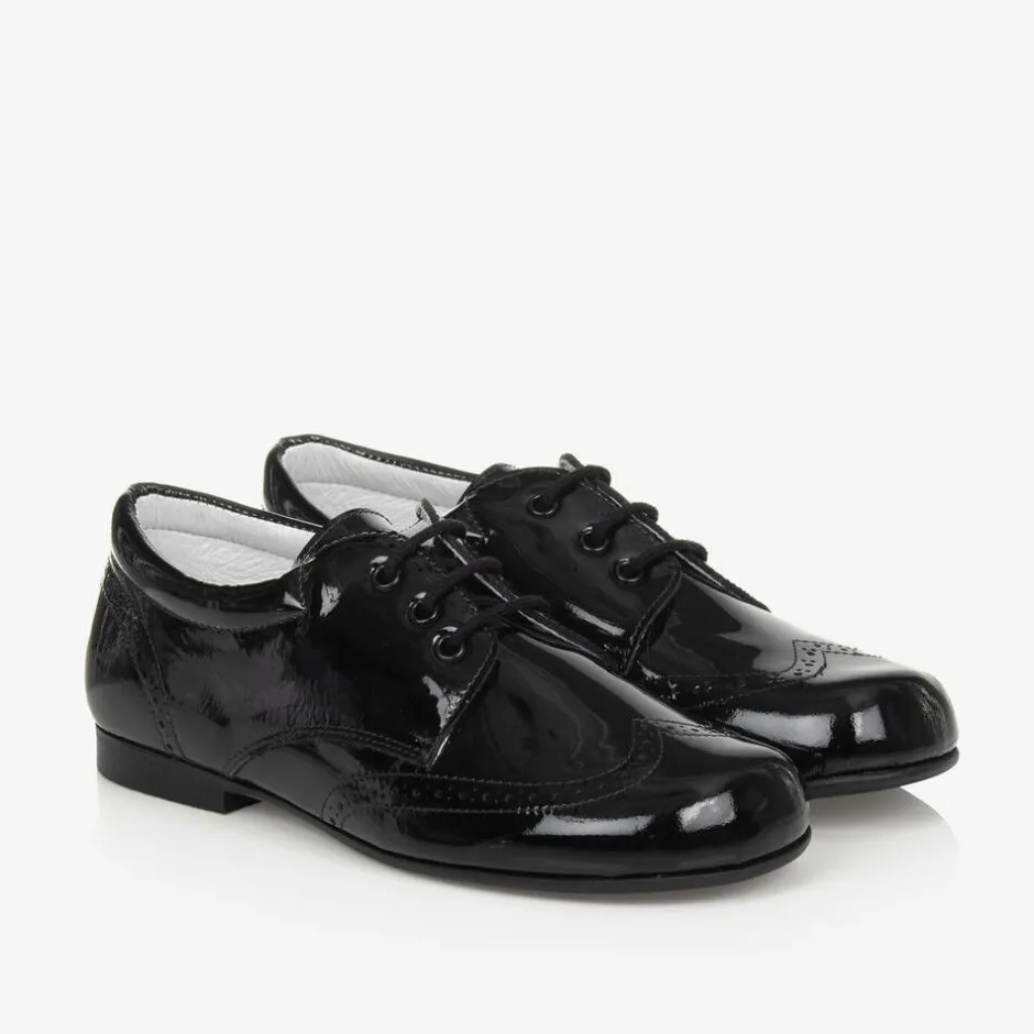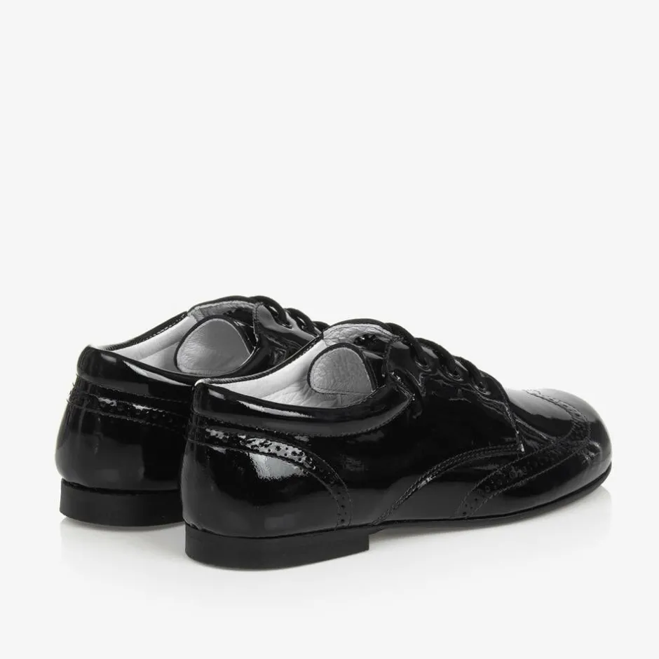 Exclusive to Childrensalon, a pair of smart black patent leather lace-up shoes for boys by Children's Classics. Soft and comfortable, these traditional style brogues have a leather lining, padded insole and a rubber outsole.