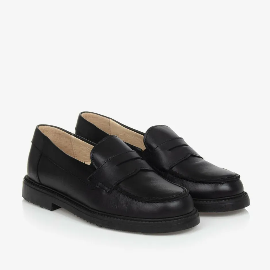 Exclusive to Childrensalon, a pair of black leather shoes for boys from Children's Classics. In a traditional loafer style, these classic slip-on shoes have a soft leather lining, cushioned insole and sturdy, non-slip rubber outsole.
