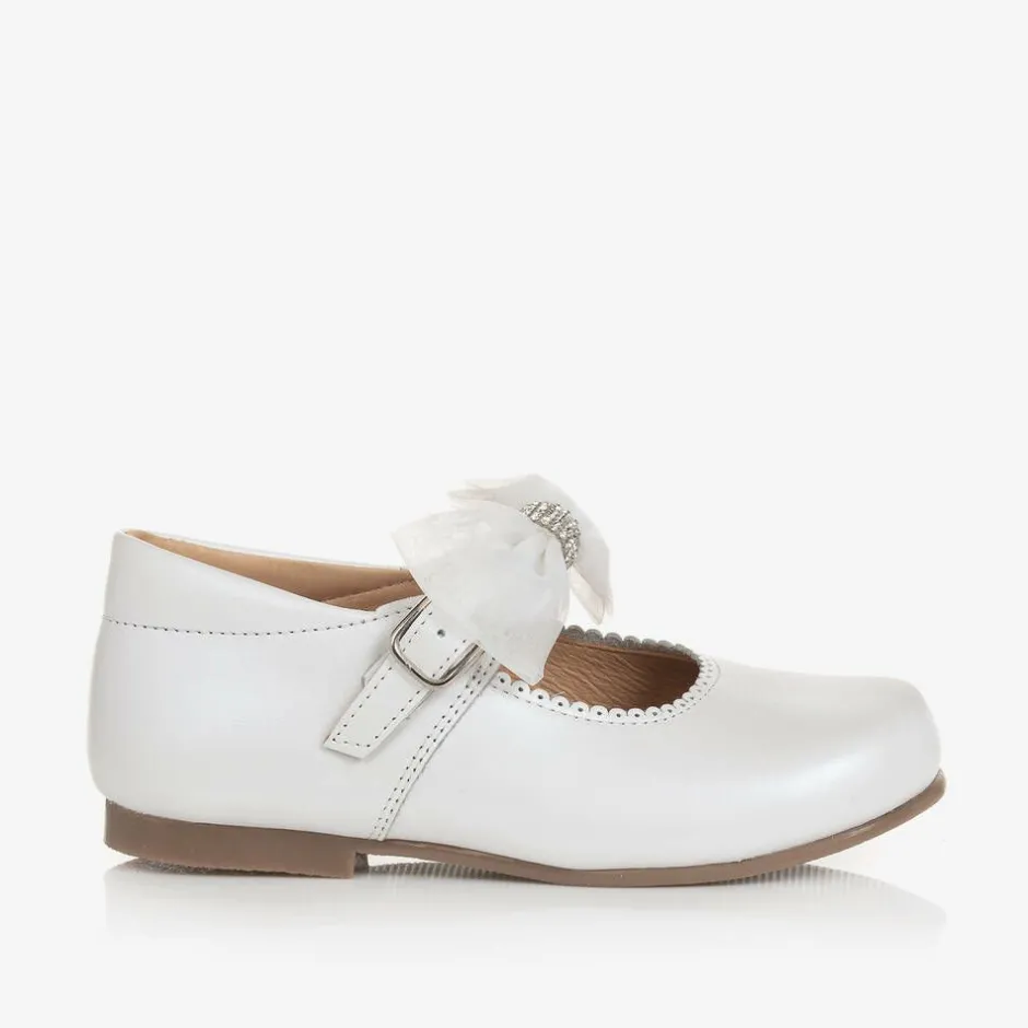 Girls smart white leather shoes from Children's Classics, exclusive to Childrensalon. Made and lined in soft supple pearlized leather, this classic Mary Jane style has a comfortable padded leather insole. They have lovely punch hole scalloped detail on the front and fasten with a buckle strap that comes with a detachable organza and diamanté bow.