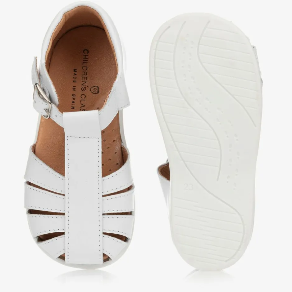 Exclusive to Childrensalon, a pair of white leather closed toe sandals for boys and girls by Children's Classics. They have a shaped leather inner sole for support and non-slip rubber soles. The buckle fastening strap can be adjusted for a good fit.