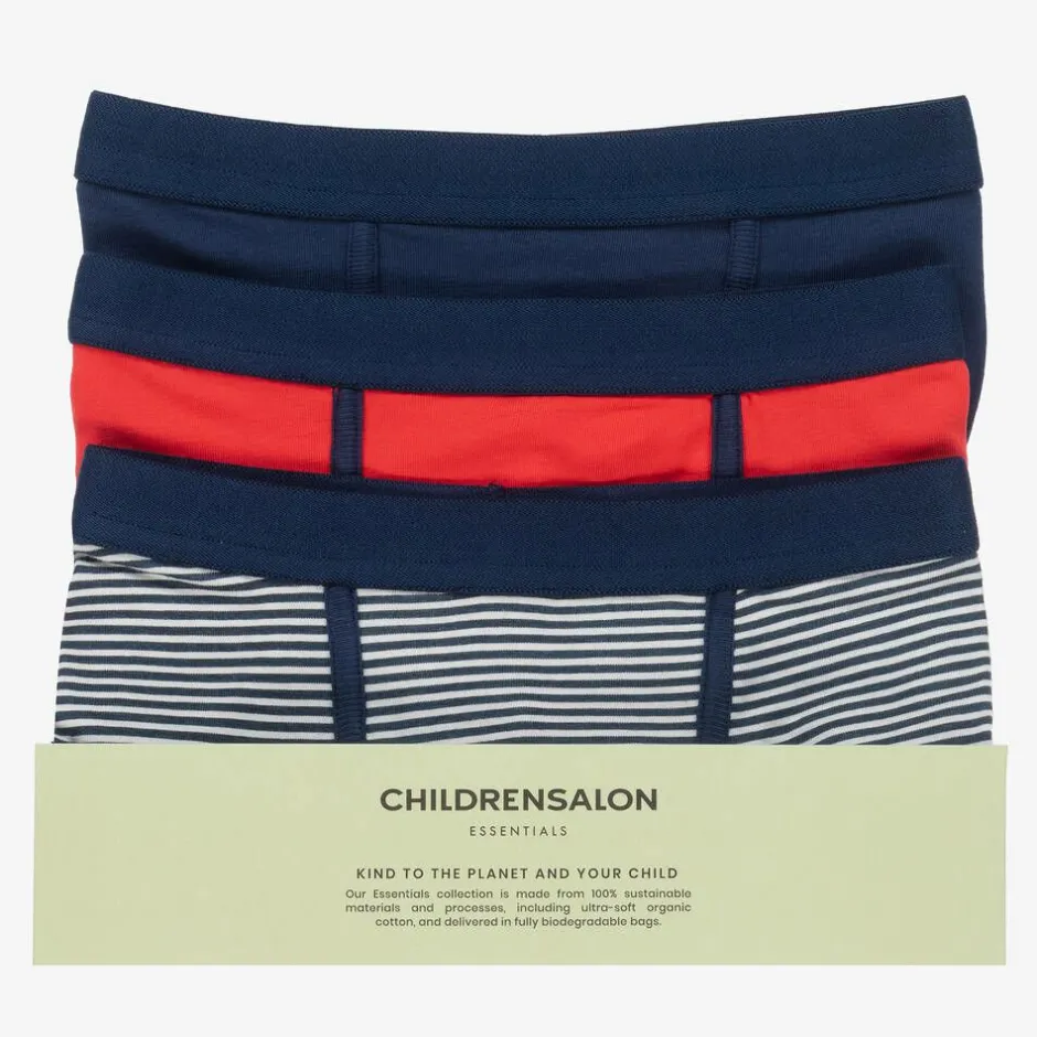 Pack of three comfortable boxer briefs for boys by Childrensalon Essentials, made in ultra-soft, stretchy organic cotton jersey with an elasticated waistband. One pair has navy blue Breton stripes, while one pair is plain navy blue and the other is red. The set is presented in fully biodegradable packaging.