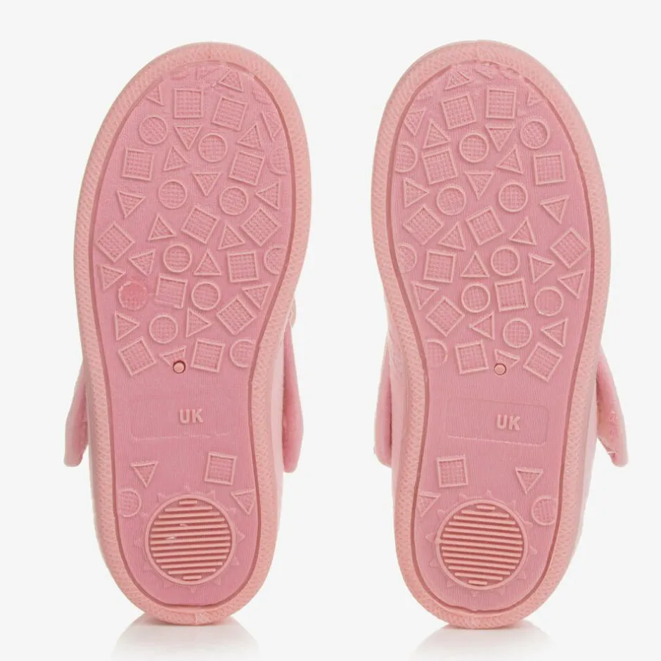 Beautifully soft pink bunny slippers for girls by Chipmunks, with plush textile uppers. They have a cute bunny face on the upper with adorable pop-up ears on the front. Fastening easily with velcro, they also have a plush textile insole and a non-slip rubber outer sole.