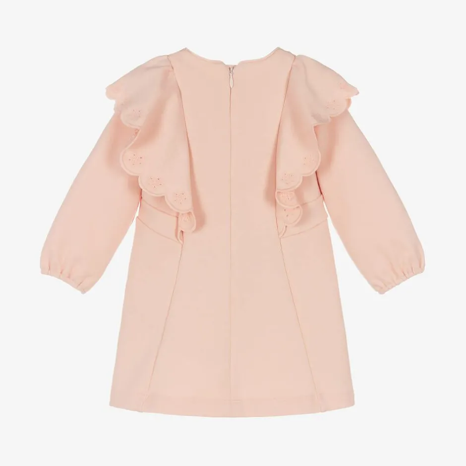 Pretty pink long-sleeved dress for baby girls by luxury French designer Chloé, made in a cotton and viscose blend jersey. It has large, scalloped frills on the lined bodice, beautifully embroidered with flowers. The dress is panelled, creating a flared design, with subtle logo embroidery on one side and gently elasticated cuffs. It fastens with a concealed zip on the back.