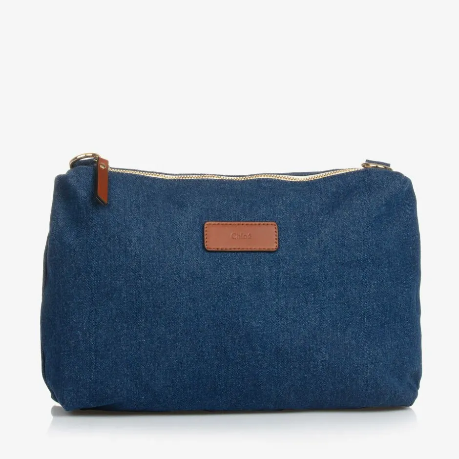 Blue denim changing bag by luxury French fashion house Chloé, with brown leather trims. Made in organic cotton, this stylish bag has woven carry handles and strap detailing in tan brown, with white logo prints for a signature look. There is a zip-fastening main compartment, two side pouches for bottle storage, and internal pouches and pockets for easy organisation. The bag comes with an adjustable shoulder strap and useful stroller straps, together with a popper-fastening changing mat and a branded zipped pouch for extra mum or baby essentials.