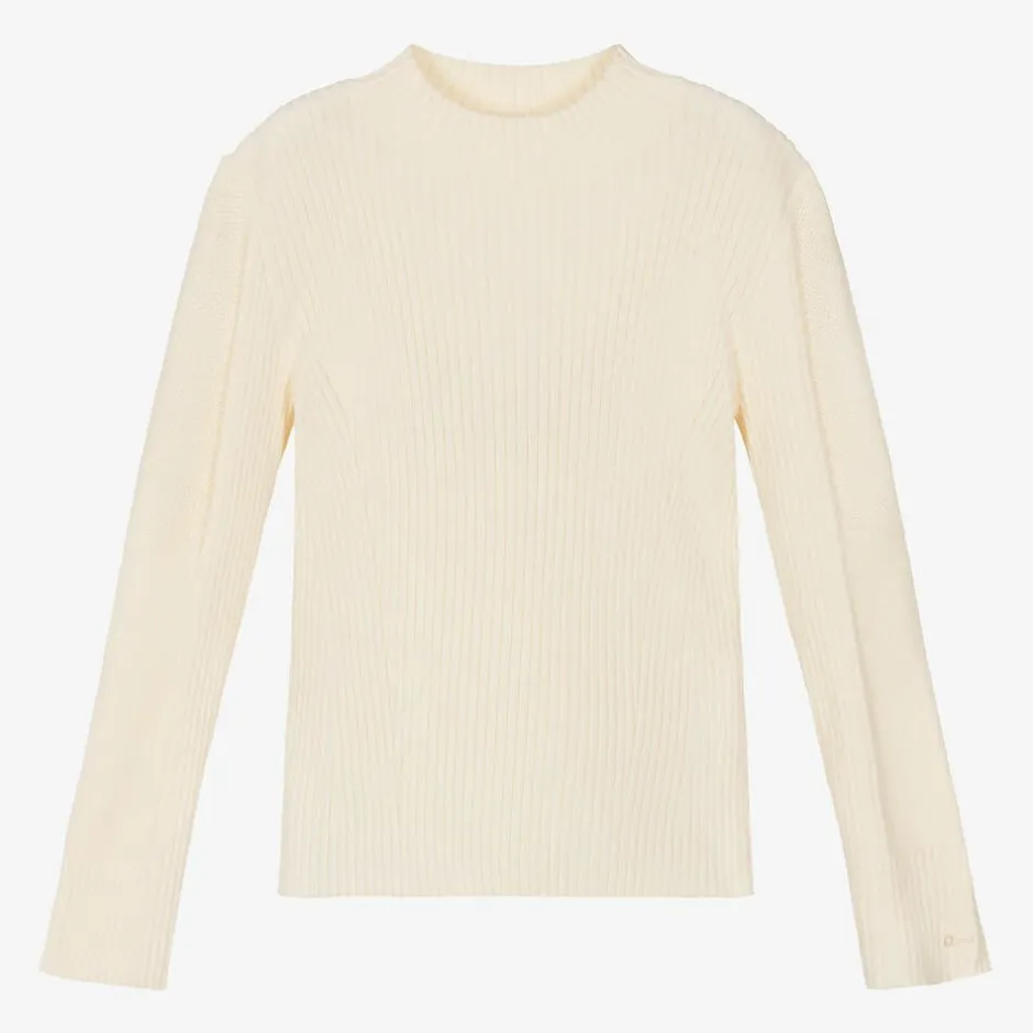 Ivory Mini-me sweater for girls by luxury label, Chloé. This simple, turtleneck top has contrasting knitted panels and a slim fit. Made in a beautifully soft organic cotton and wool blend for warmth and comfort, it has the designer's signature logo delicately embroidered on one of the cuffs, signing off the look with a subtle branded touch.