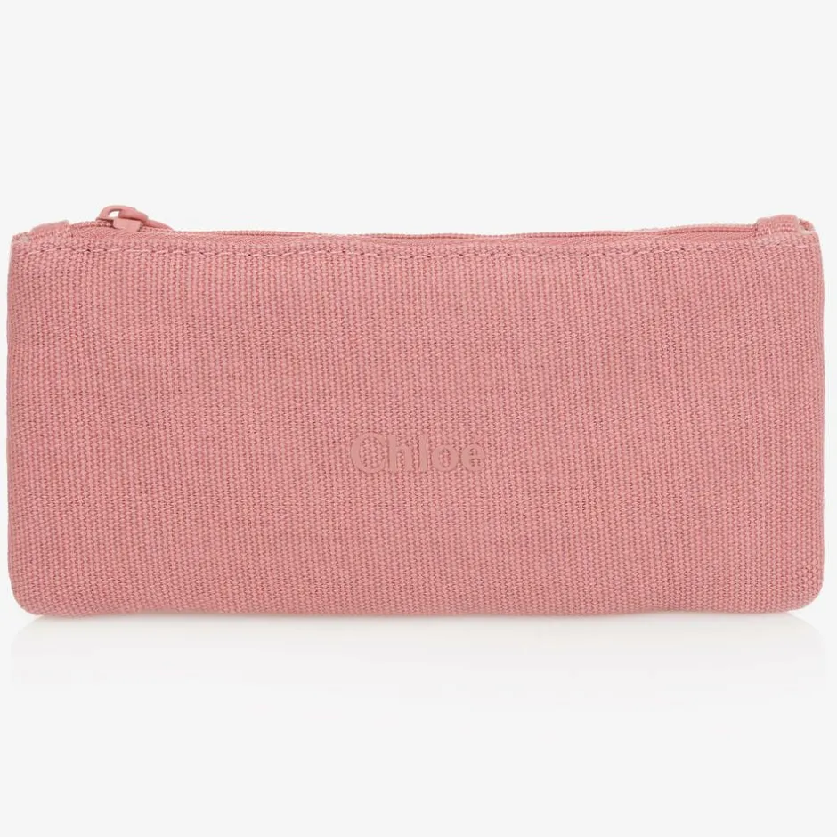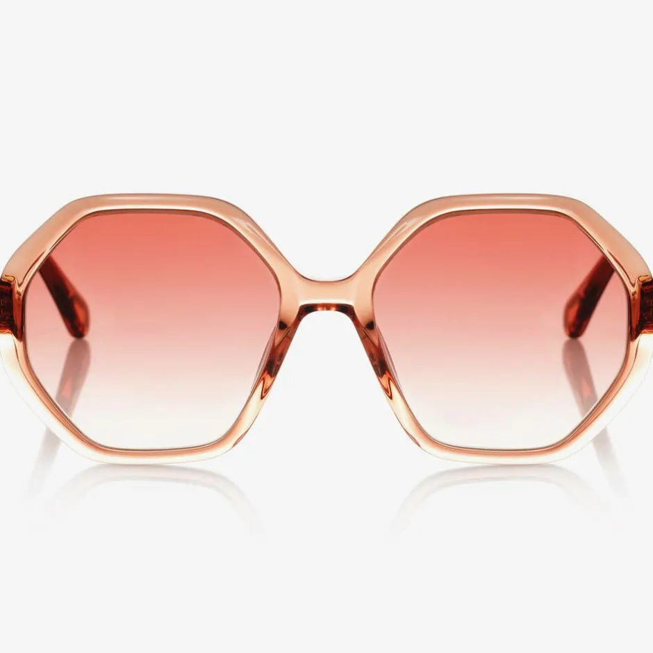 Clear orange sunglasses for girls by luxury French designer Chloé, featuring the brand's iconic hexagonal-shaped frame. They have stylish gradient lenses with a category 2 filter, providing good protection against sun glare. They have braided detailing on the side and a gold logo on the left temple. The sunglasses come in a branded protective carry case with a matching care cloth.