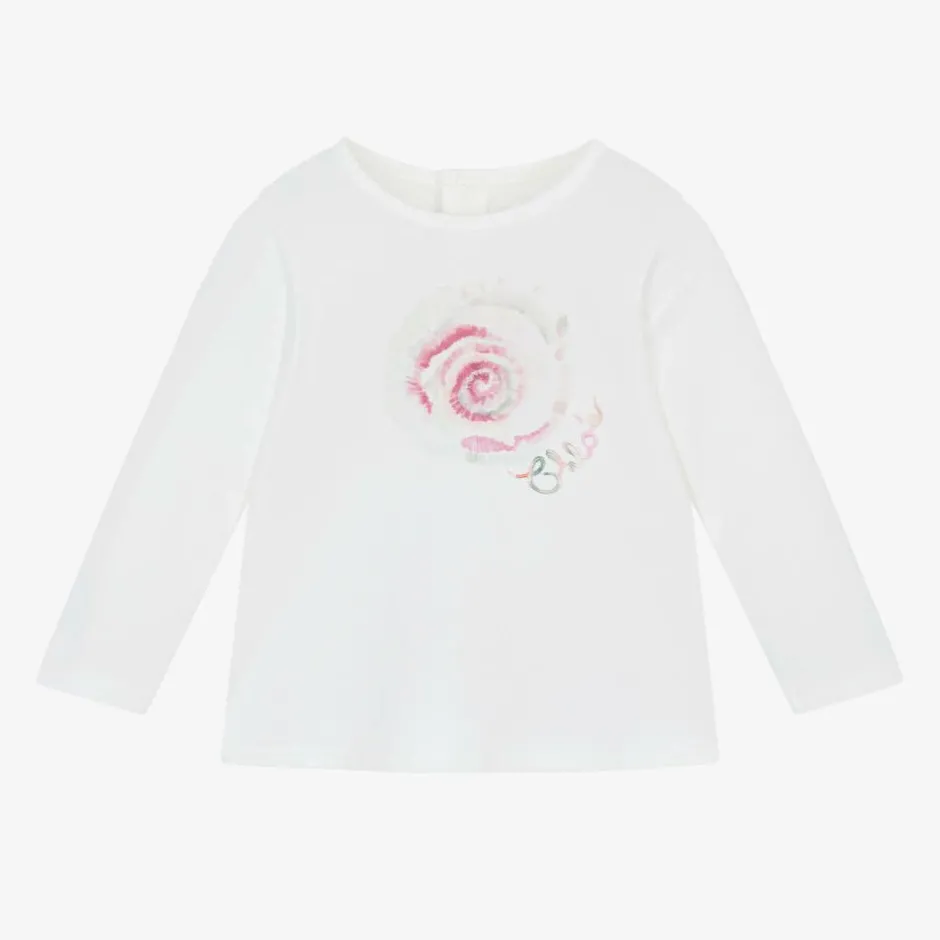 Lovely white long-sleeved top for younger girls by luxury fashion house Chloé, made in soft organic cotton jersey. A pretty watercolour spiral print can be seen on the front, with an embroidered logo below in complementary pastel shades. Ideal for comfortable, casual wear, it fastens with poppers on the back for easy dressing.