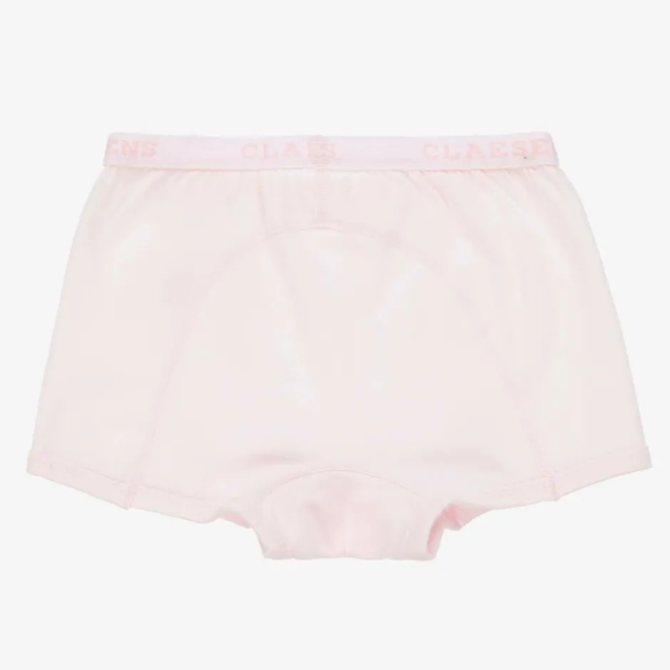 Pack of two pale pink boxer-style knickers for girls by Claesen's, made in soft and stretchy cotton jersey. Comfortable and easy to wear, they have a tonal logo branded waistband.