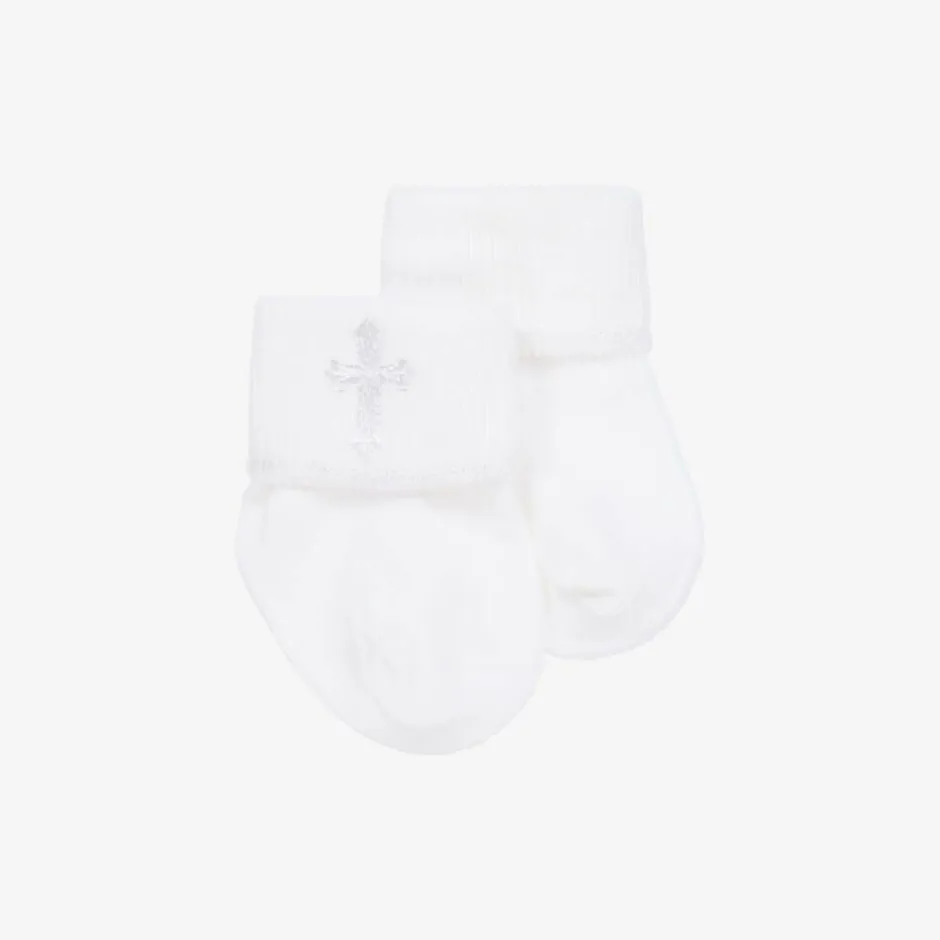 Gorgeous little white socks for baby boys and girls by Country Kids, made from a soft and stretchy cotton blend knit. An ideal Christening accessory, they are embroidered with religious symbols on the cuffs.