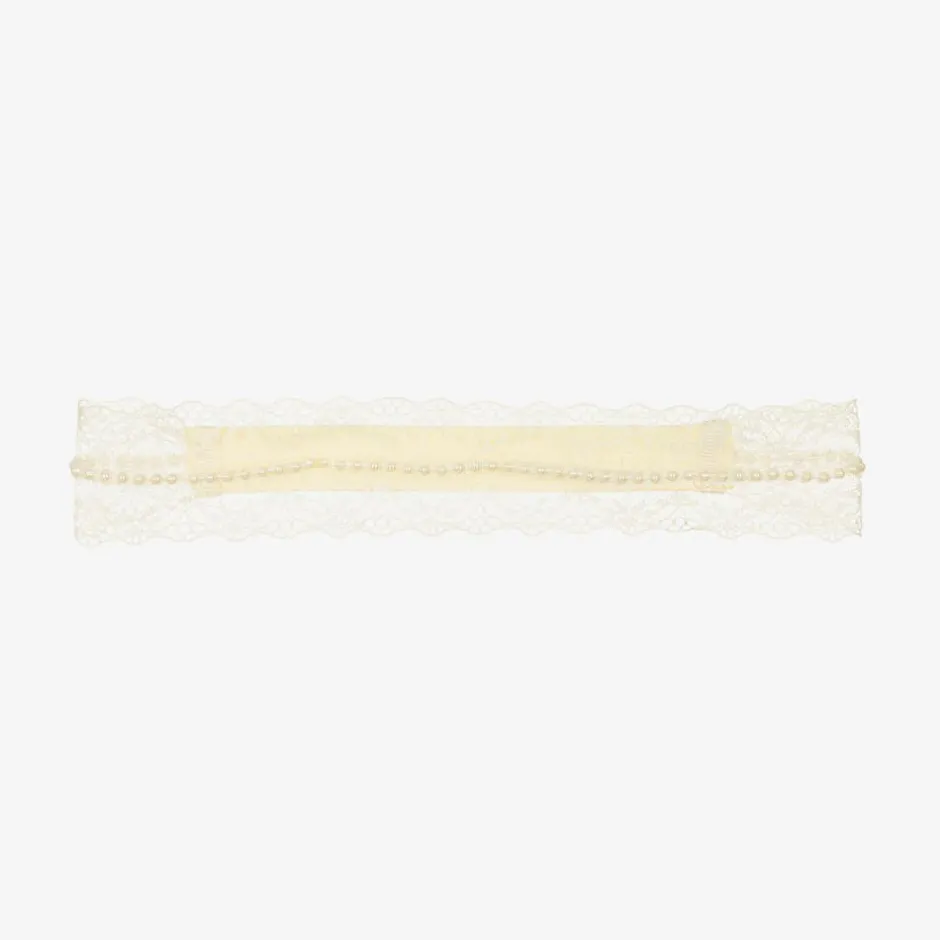 Gorgeously elegant, this ivory headband for baby girls is by British brand Cute Cute. Beautifully handmade from lightweight lace, it is embellished with a row of faux pearls for a delicate finish. There is an elasticated panel on the back to ensure comfortable wear.