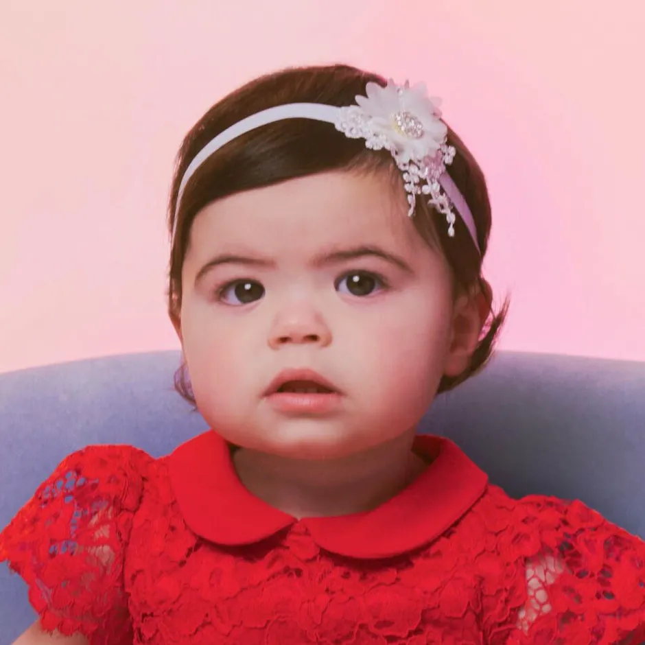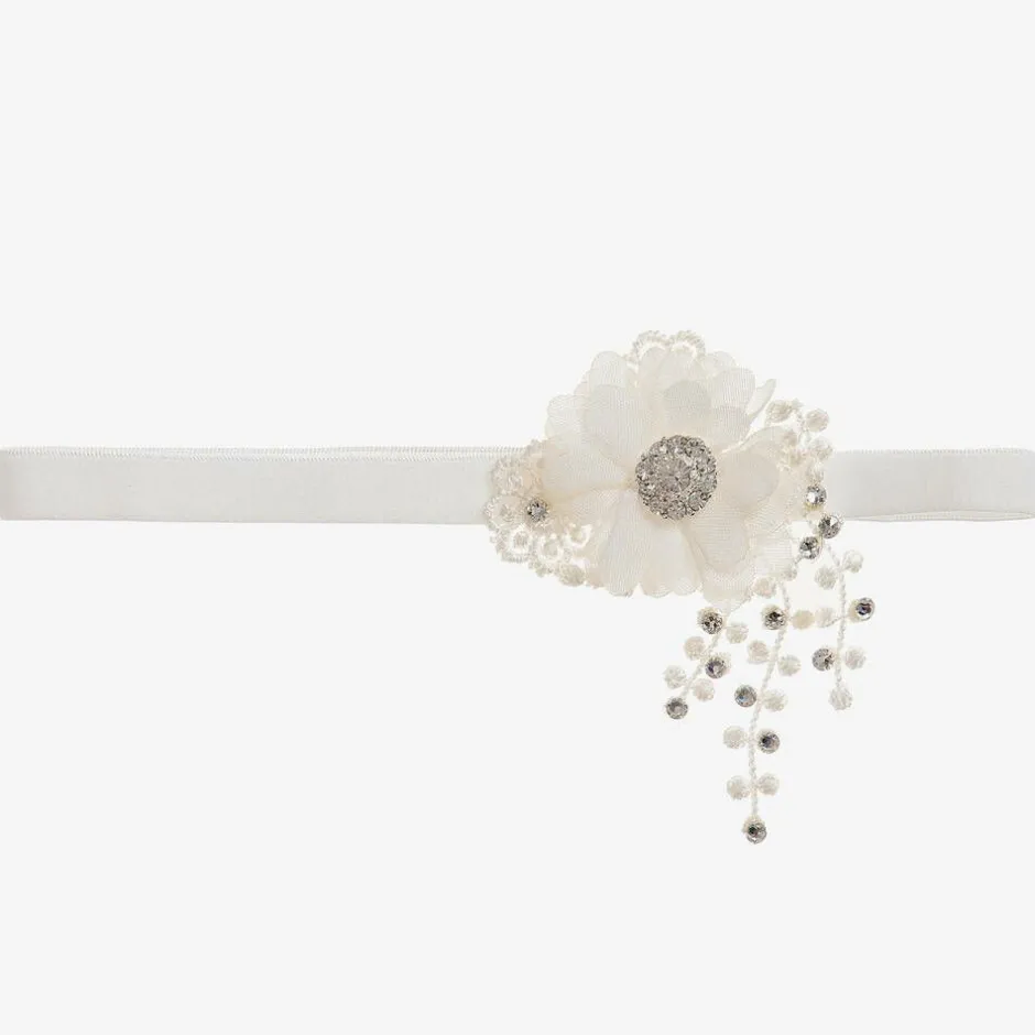 A simply adorable pale ivory headband by Cute Cute. It has a beautiful lace and chiffon flowers scattered with Swarovski crystals on a soft elasticated band.