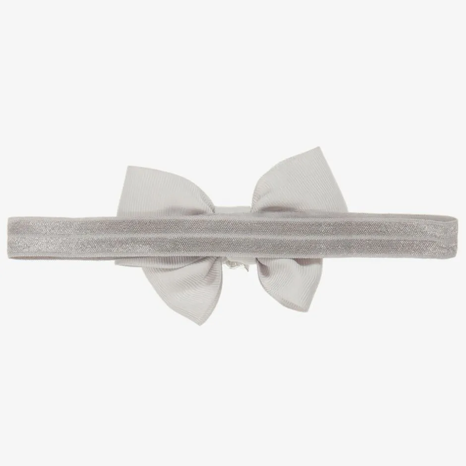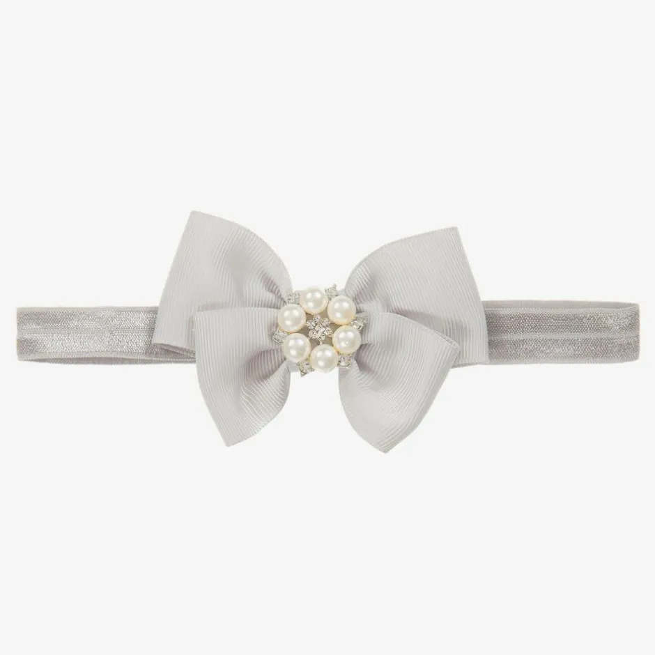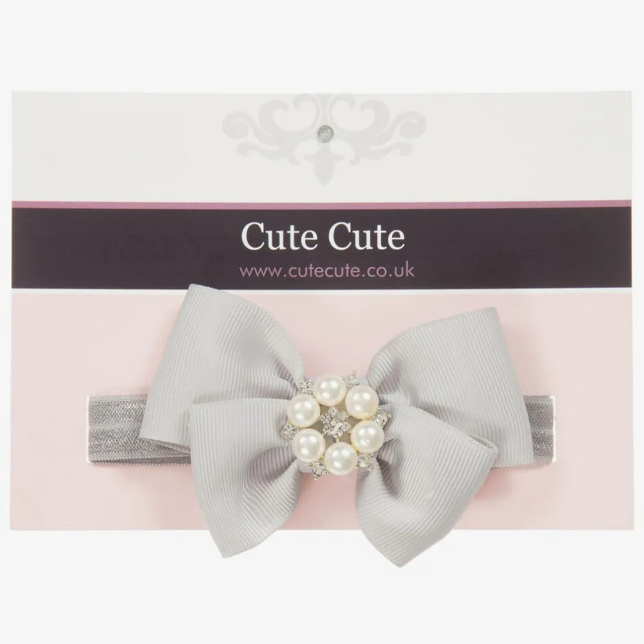 A handmade grey ribbon bow by Cute Cute on a soft and stretchy elastic band. It has pearl beads and diamanté, making this headband is the perfect finish to any outfit.