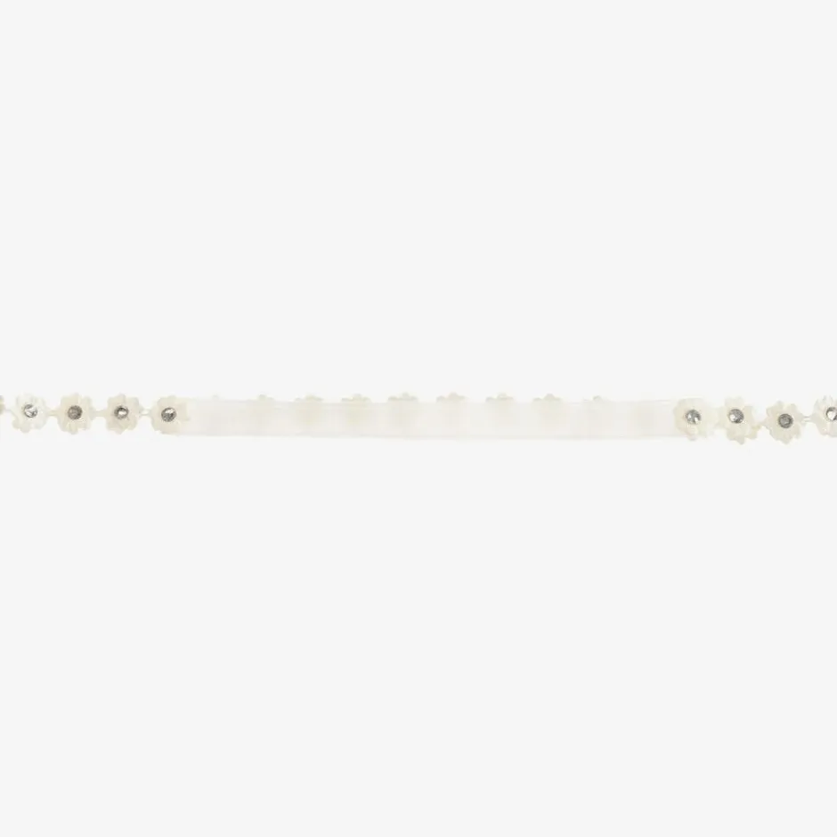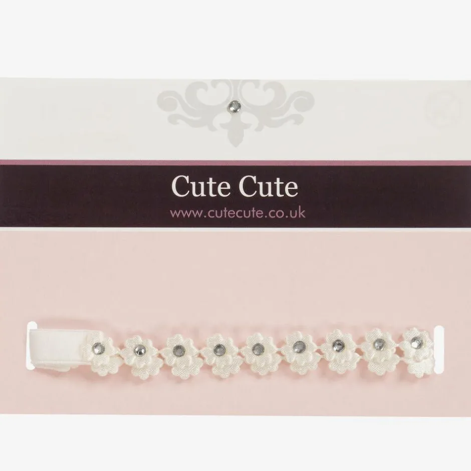 Cute Cute girls delicate ivory headband, decorated with satin flowers individually embellished with diamanté. It has a soft elastic section on the back so it can stay secure on the head.