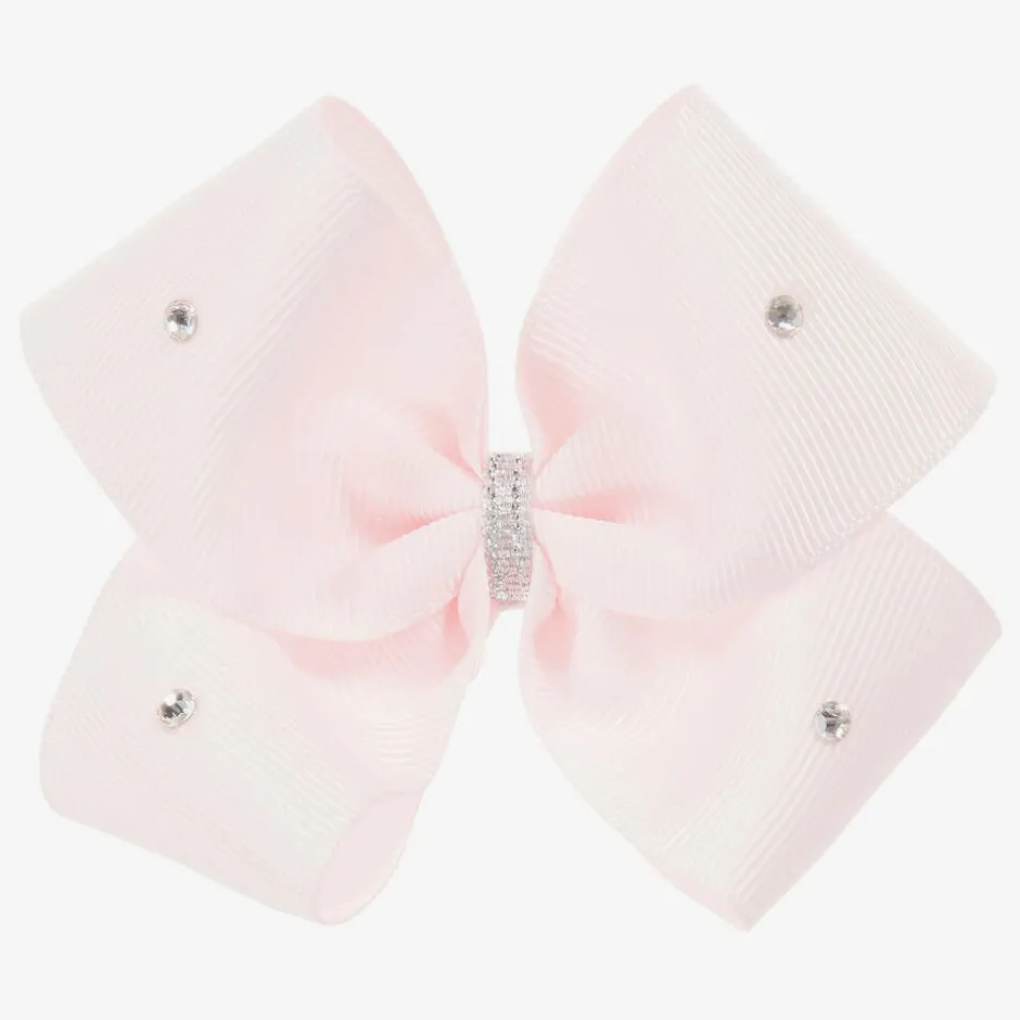 A pale pink grosgrain ribbon hair clip by Cute Cute. Lovingly handmade, this pretty hair accessory is studded with sparkling diamanté to add a touch of glamour to an outfit. It secures to the hair with a metal clip.