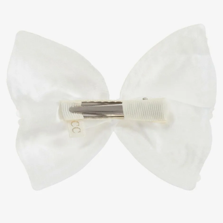 A pretty ivory pearl beaded hair clip by Cute Cute. Shaped into a bow, the centre is studded with sparkly diamantés. There is a crocodile clip fastening on the back.
