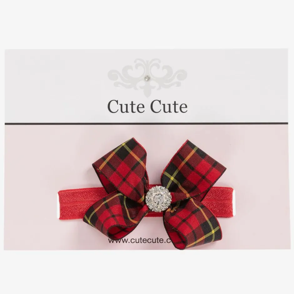 Girls red headband by Cute Cute. Handmade, it has a pretty red and black tartan bow with a sparkling diamanté centre.