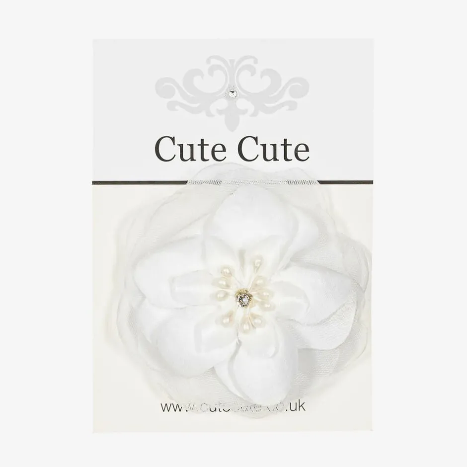 Girls sweet white handmade hair clip by Cute Cute. Lovely for a special occasion, the metal clip is decorated with a white satin and chiffon flower, with pearls and sparkling diamanté detailing.