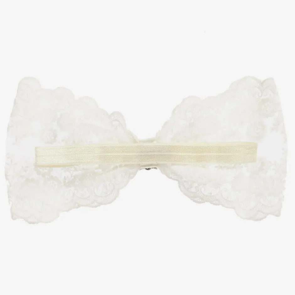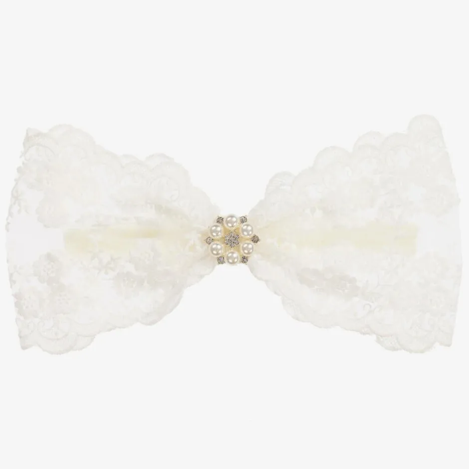 Girls ivory headband by Cute Cute with a large white lace bow, and pearl and diamanté decoration.