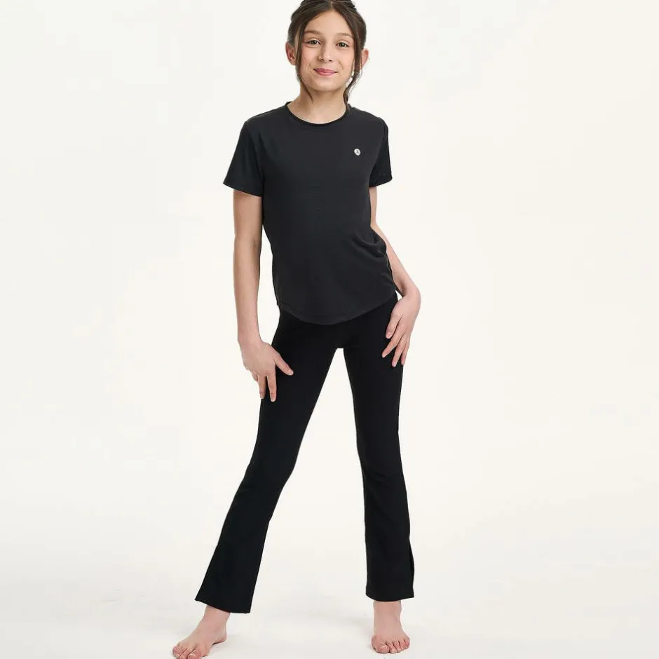 Girls black flared leggings by Danskin, the American activewear designer. The super soft, ribbed fabric is ideal for sports, boasting four-way stretch, free movement and breathability. The wide, elasticated waistband ensures a comfortable fit, and the split cuffs add a stylish twist.