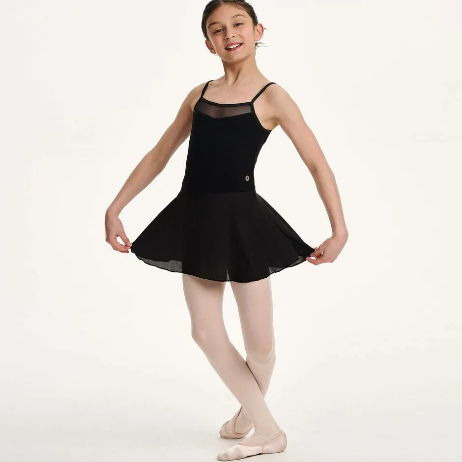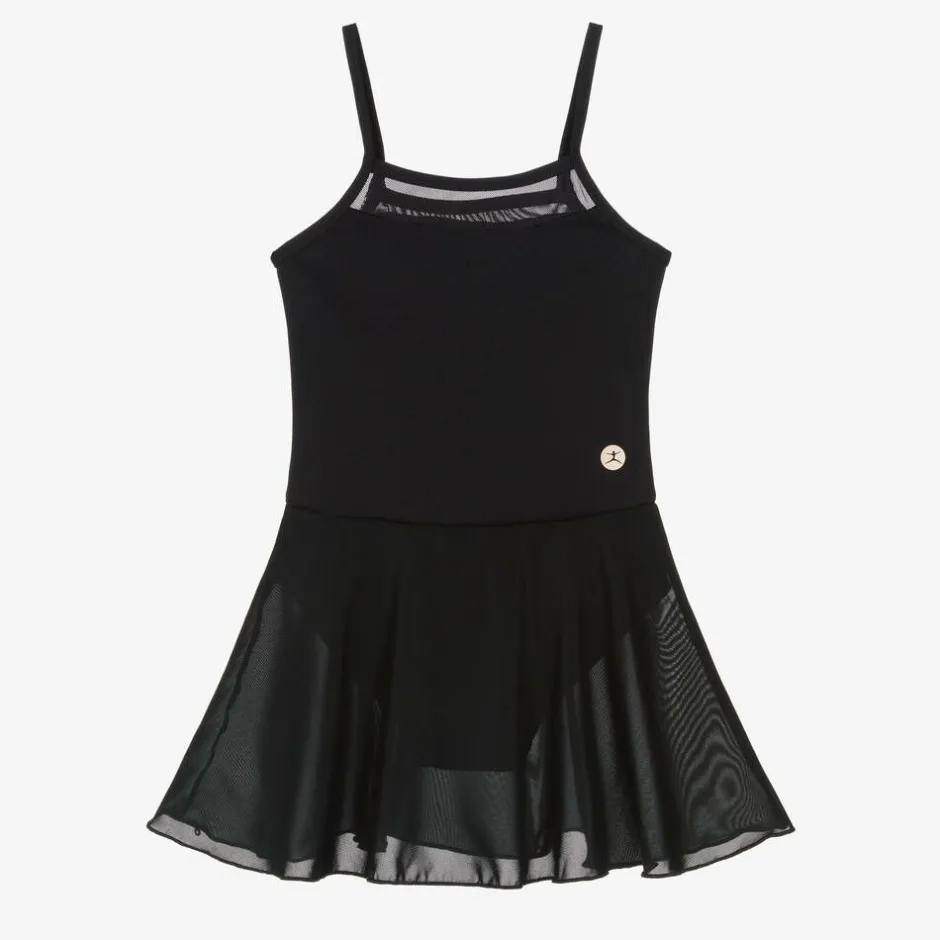 Black leotard dress for girls by dancewear brand, Danskin. Made using the designer's super soft four-way stretch fabric for free movement, the leotard has sheer mesh panels on the front and back and slim shoulder straps. The attached skirt is sheer, lightweight and ideal for dance classes. Rose gold logo prints complete the style.