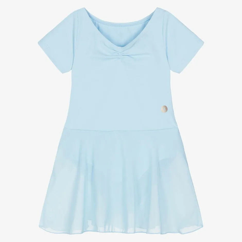 Pretty pale blue leotard dress for girls by dancewear brand, Danskin. Made using the designer's super soft four-way stretch fabric for free movement, the leotard body has a ruched centre and short sleeves. The sheer skirt is attached to the breathable, fitted leotard and is beautifully floaty for ballet and dance classes. Rose gold logo prints complete the style with a branded touch.