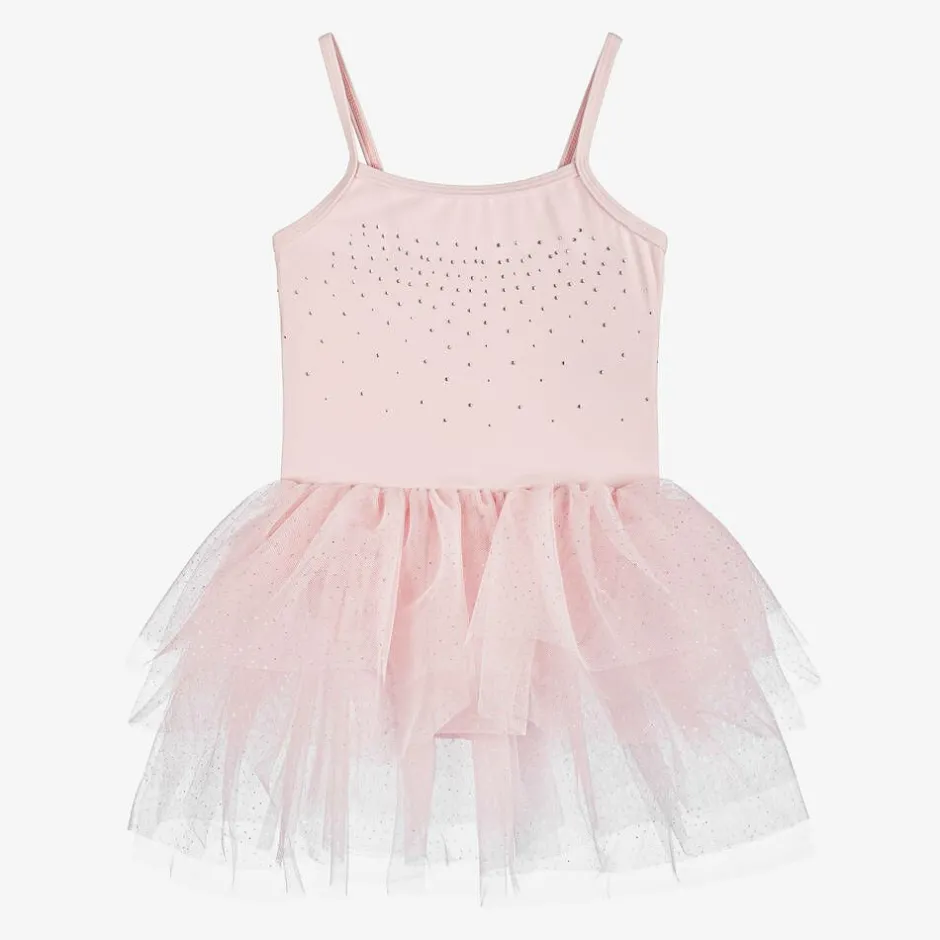 A delightful pale pink tutu dress for girls by dancewear brand, Danskin. Lovely for ballet and dance classes, the leotard is made from a super soft and stretchy fabric, allowing free and easy movement. It is designed with slim shoulder straps and has beautifully sparkly diamantés decorating the bodice. The gorgeous tutu skirt is made from tiered layers of glittery tulle for a pretty finish.