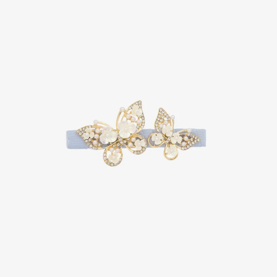 Girls hair clip from David Charles, with embellished butterflies on a blue ribbon-covered clip. The crocodile clip ensures a secure fit and the lovely iridescent flowers and faux pearls give an elegant finish.