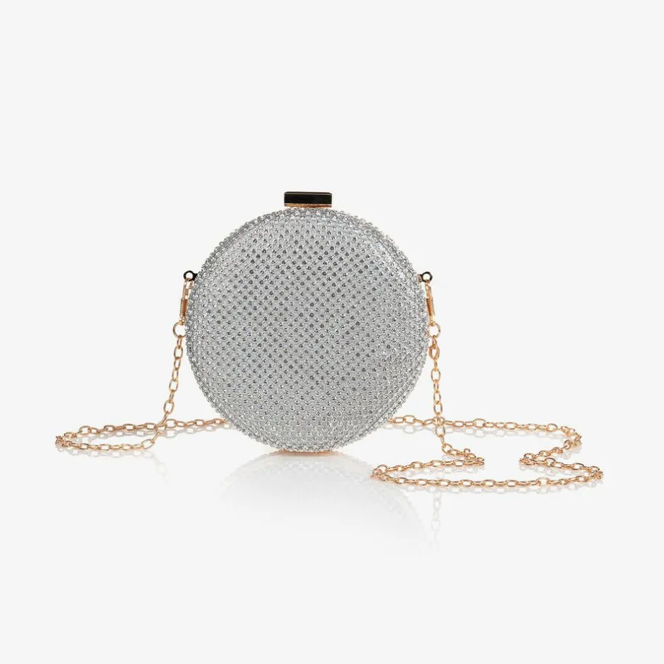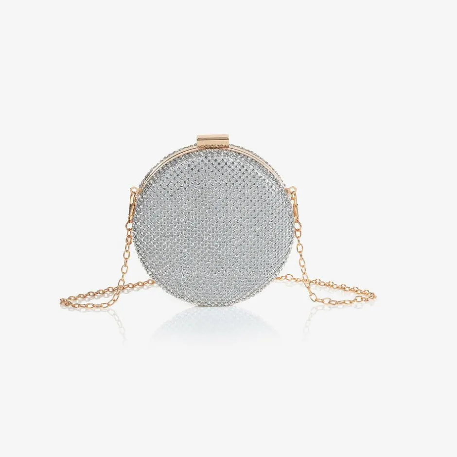 Sparkling silver round bag for girls by David Charles, encrusted with dazzling diamantés. This special occasion bag has a small, satin-lined compartment and a golden metal snap clasp fastening. A detachable, fine gold metal chain crossbody strap adds a versatile carry option to this glamorous clutch bag.