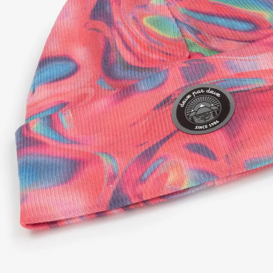 Warm and cosy, a pink and blue knitted hat for girls by Deux Par Deux, with a swirling, marbled pattern. It has a large pale blue pom-pom on top and a reflective silver logo badge sewn on the front. An ivory fleece lining gives extra protection against the cold.