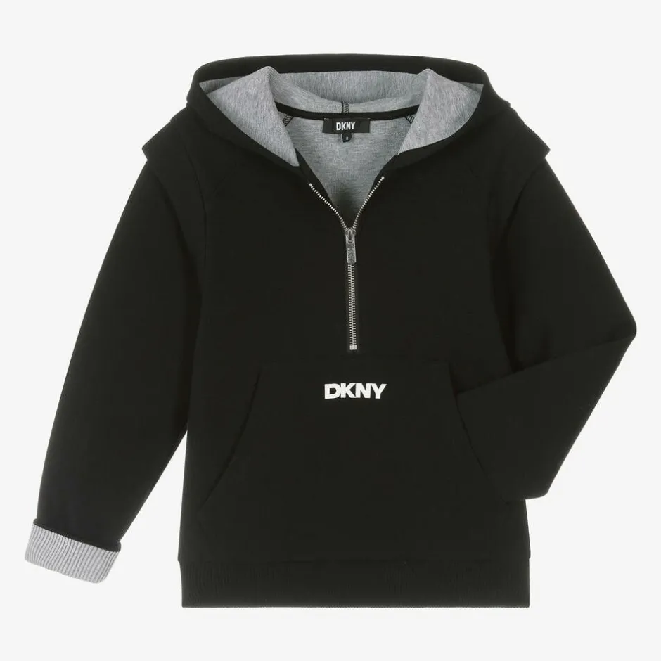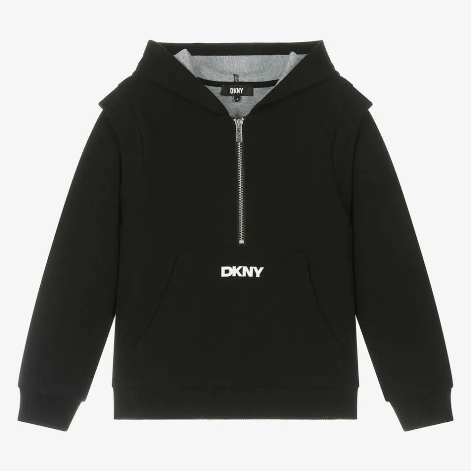 Black hoodie for boys and girls by DKNY, made in soft, mid-weight cotton jersey. This casual style has cosy ribbed trims, with a pouch pocket and a half zip fastening on the front. It has a contrasting grey underside and there is a white logo printed on the front for a distinctive designer finish.