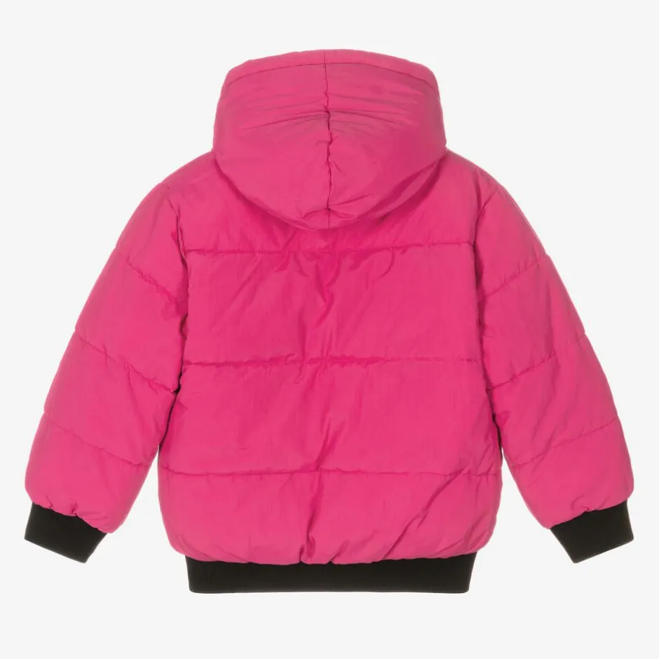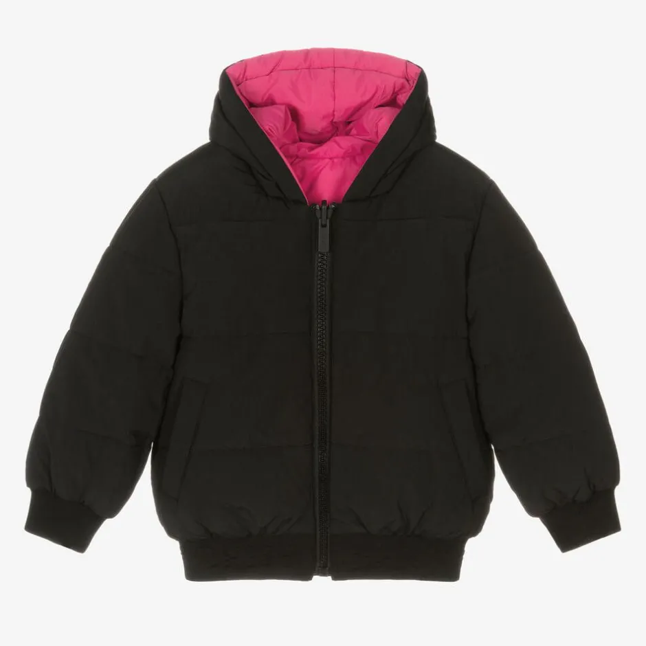 Cool black and pink reversible puffer jacket for girls by DKNY. Made in smooth fabric, it is warmly padded with a fixed hood and cosy ribbed trims for extra warmth. The black side has slanted front pockets with raised logos on the knitted hem and a shiny black logo on the hood. The fuchsia pink side has side seam pockets and a small shiny black logo on the chest for a more subtle designer finish. Versatile and colourful, this fun jacket fastens with a branded zip on the front.