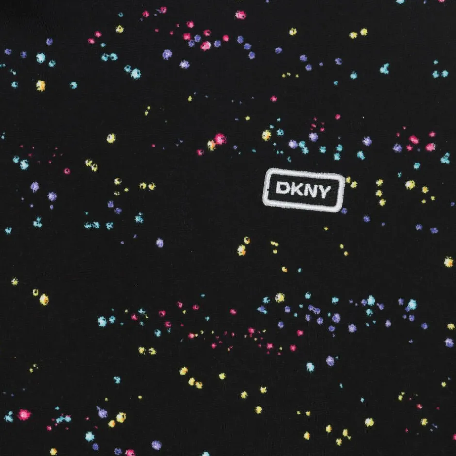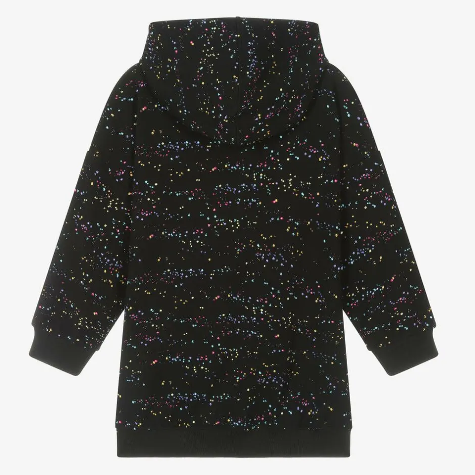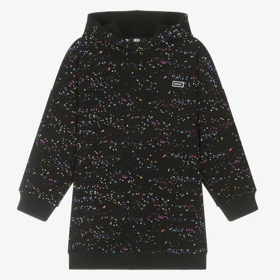 Cool and casual black sweatshirt dress for girls by American streetwear brand DKNY. Designed with a multicolour starlight pattern, this laid-back style is made in stretchy Milano jersey, with an attached hood and ribbed trims. An embroidered logo on the chest adds a finishing designer touch.