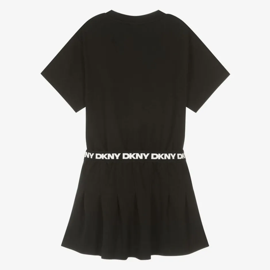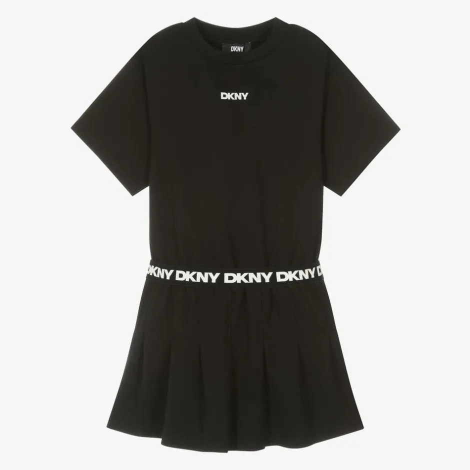 A black short-sleeved dress for girls by DKNY. The T-shirt-style bodice is made from soft Milano jersey and is printed with a bold white logo on the chest for a signature look. In a cool dropped-waist style, it has a pleated twill skirt with a repeat logo-detailed elasticated waistband for comfortable wear.