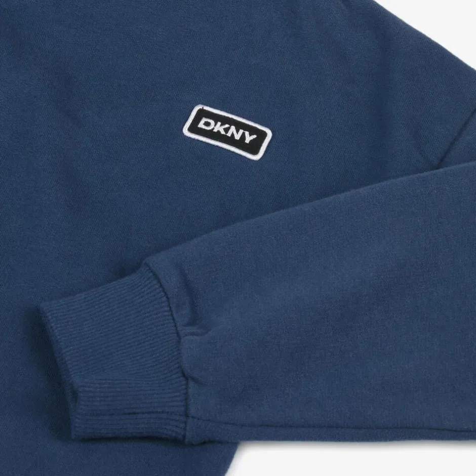 Cool navy blue hoodie for boys and girls by DKNY. Made in mid-weight cotton jersey with a super soft brushed feel and cosy ribbed trims, it is designed in a relaxed fit with dropped shoulders. The hood has a black waffle-textured jersey lining and a bold embroidered logo. Completing the look with a distinctive designer touch, there is an embroidered logo patch on the chest.