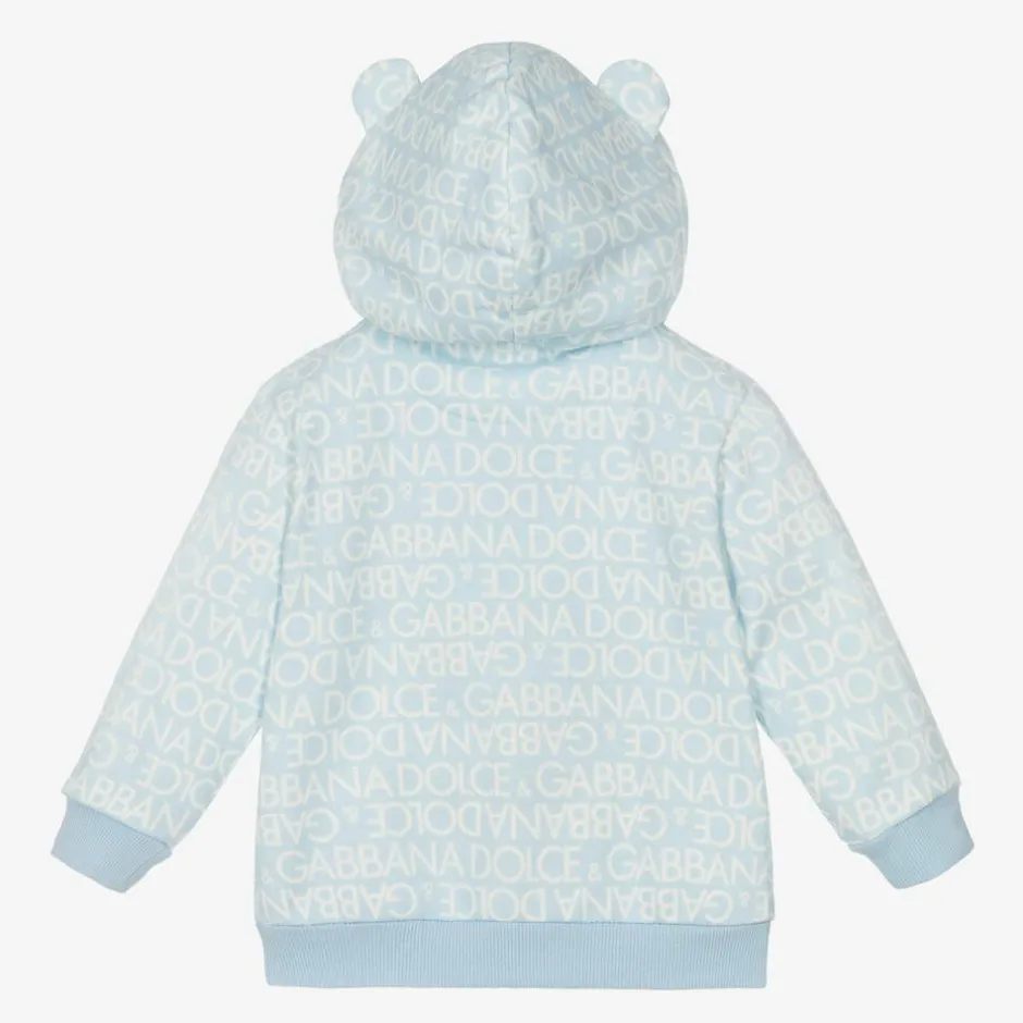 Younger boys pale blue and white zip-up top by luxury designer Dolce & Gabbana, made in soft jersey. Patterned with a bold logo design, this cute top has a sweet leopard motif appliquéd on the chest and gently ribbed trims for comfort. Long-sleeved, it fastens with a branded zip on the front and has a large jersey-lined hood, cosy for little ones.