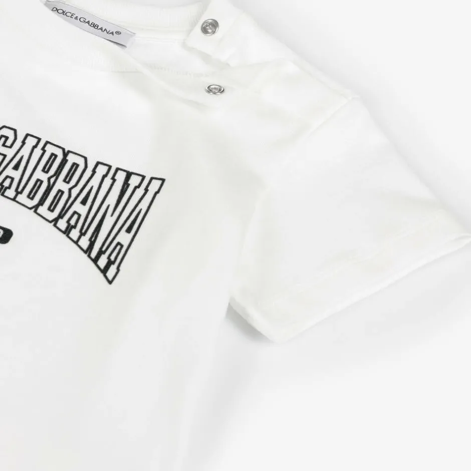 White short-sleeved T-shirt for little boys by luxury Italian brand Dolce & Gabbana. It features a black and white logo design on the front for a distinctive look. Made in soft cotton jersey, this casual tee has popper fastenings on one shoulder to help with dressing.