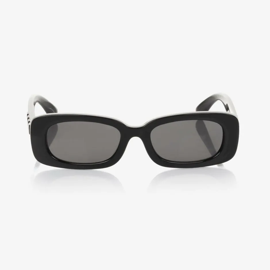 Black sunglasses for girls by luxury Italian label Dolce & Gabbana. Stylish and practical for shielding her eyes from the sun, they have dark grey tinted lenses. Adding a playful, branded touch, the designer's DG crossover logos can be seen on the arms, along with red star and happy face motifs. For safe storage, they come with a branded silicone case in vibrant green and orange, with a pink carabiner clip.