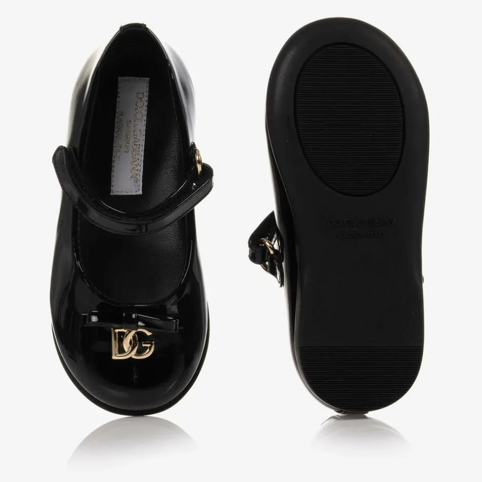 Black patent leather ballerina pumps for little girls by luxury designer Dolce & Gabbana. Lovely for both special occasions and casual wear, they have sweet little bows and a golden DG logo on the toes. They fasten with a velcro strap over the foot and have reinforced heels for sturdiness, Fully lined in soft leather, they have a lightly padded insole for an extra luxurious feel. They have a brown non-slip rubber outer sole for good grip.