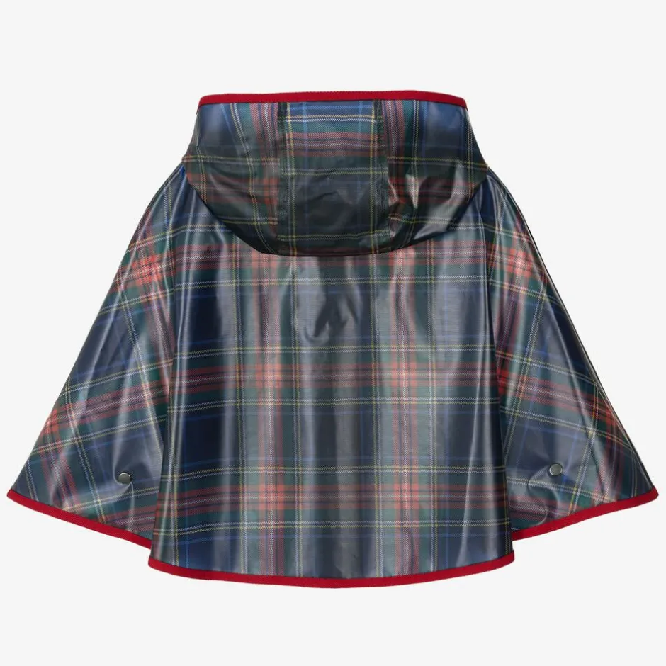 Stylish rain cape for girls by luxury Italian brand Dolce & Gabbana. Made in a smooth showerproof fabric, it has a navy blue, red and green tartan pattern and red trim This lightweight hooded cape has branded popper fastenings on the front and poppers on the sides to create armholes. It has a signed logo within the pattern on the front for a discreet designer finish.