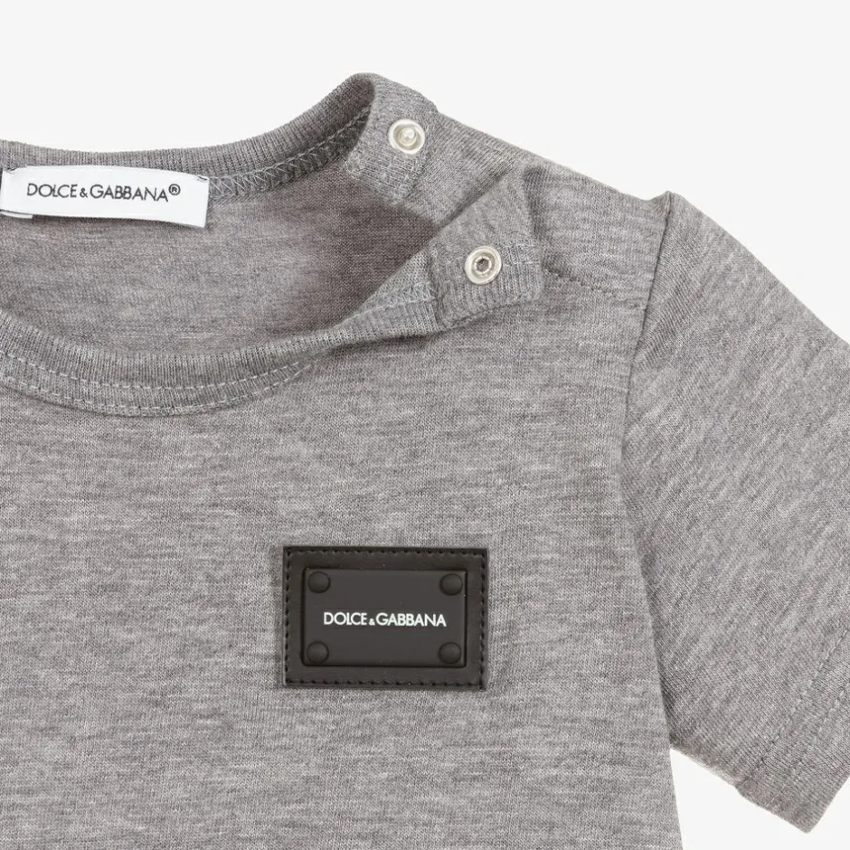 Luxury grey Dolce & Gabbana T-shirt, suitable for baby boys and girls. It is made from soft cotton jersey with a logo plaque on the chest. and useful popper fastenings on the shoulder.
