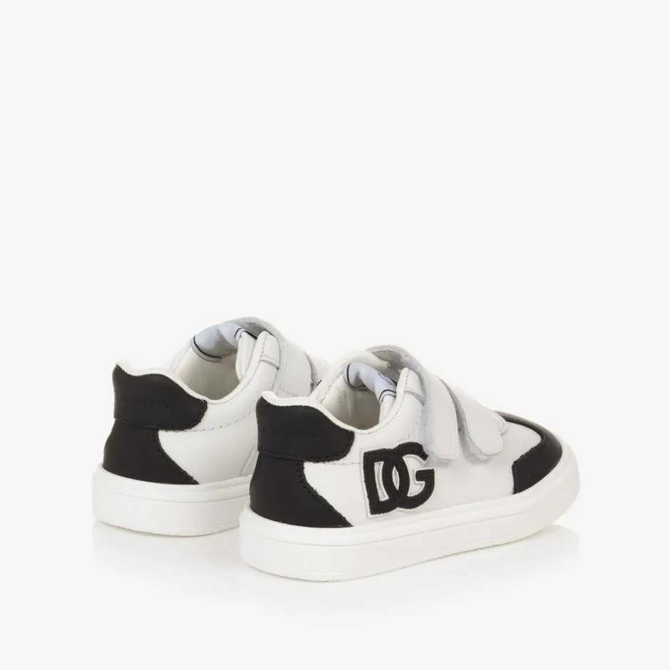 White leather trainers for baby boys and girls by luxury fashion house Dolce & Gabbana, with easy-to-use velcro straps for a secure fit. These stylish trainers have a distinctive black DG logo appliqué on one side and coordinating black trims on the toe and heel. They are lined in smooth leather and have cushioned insoles to ensure comfort in every step. For improved grip, they have a non-slip rubberised outer sole.