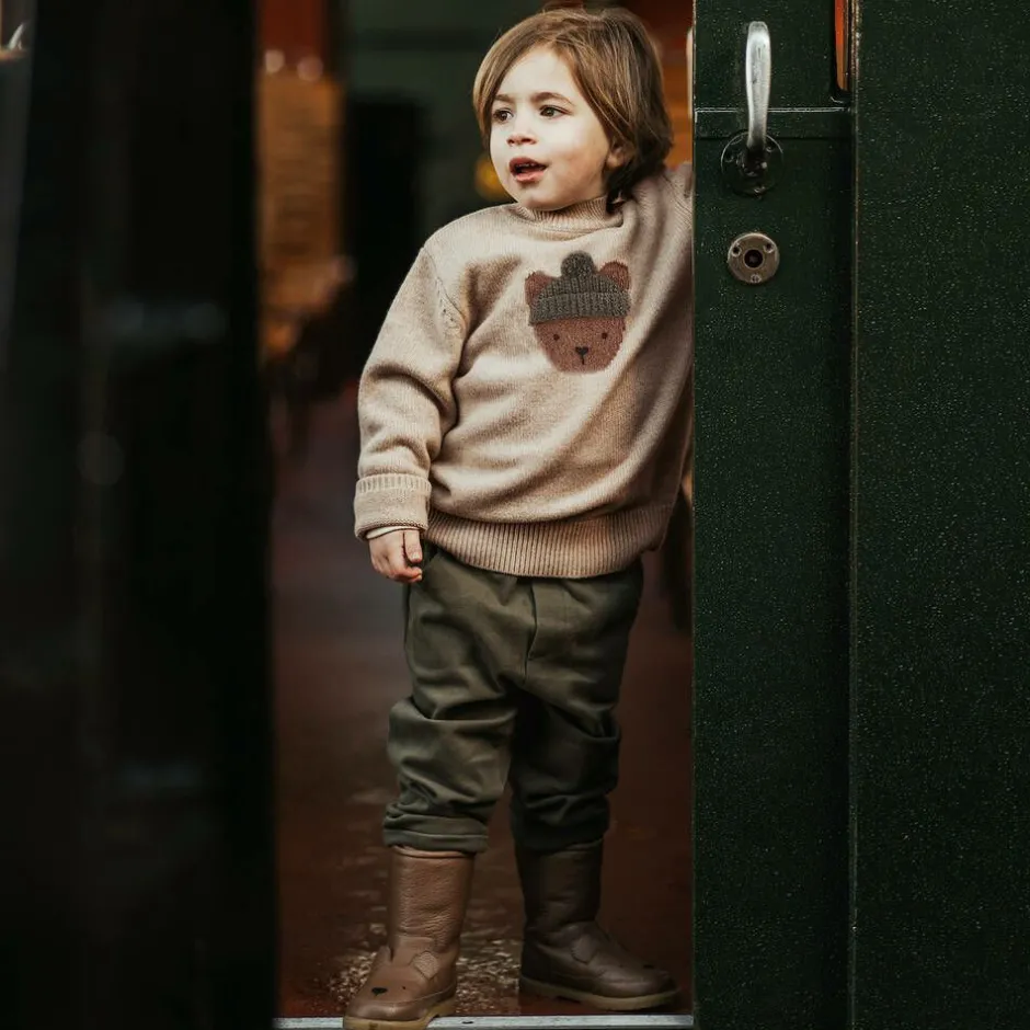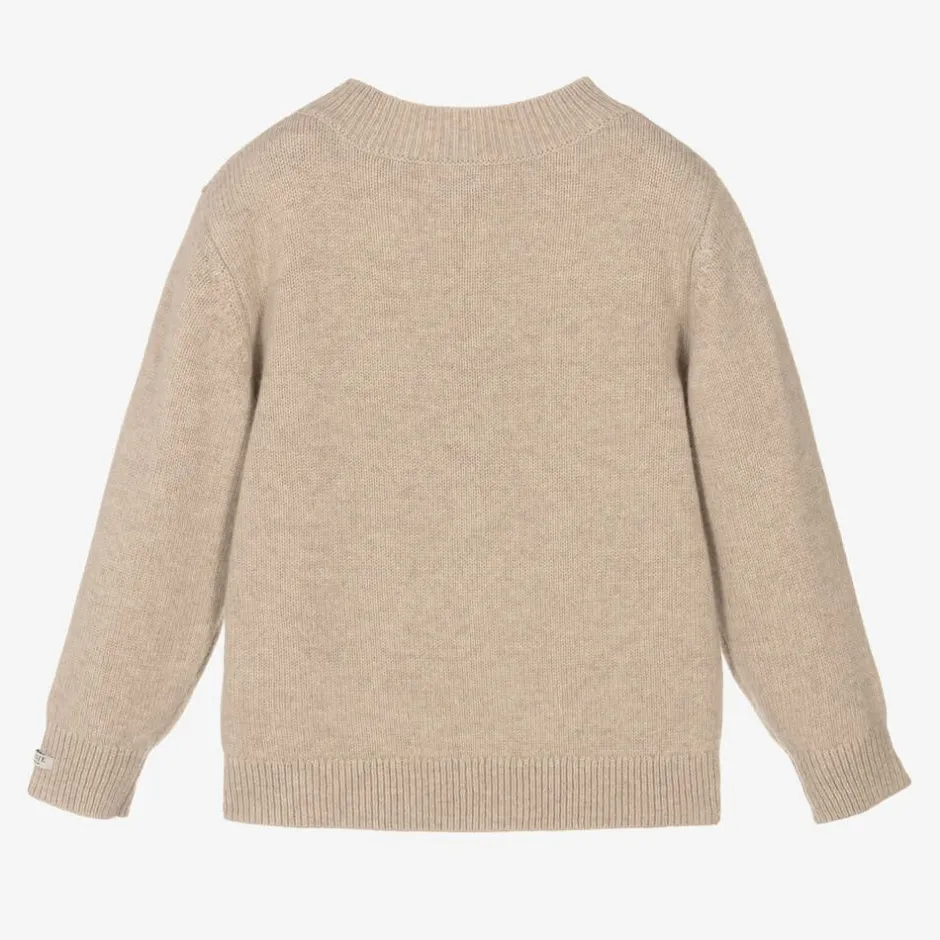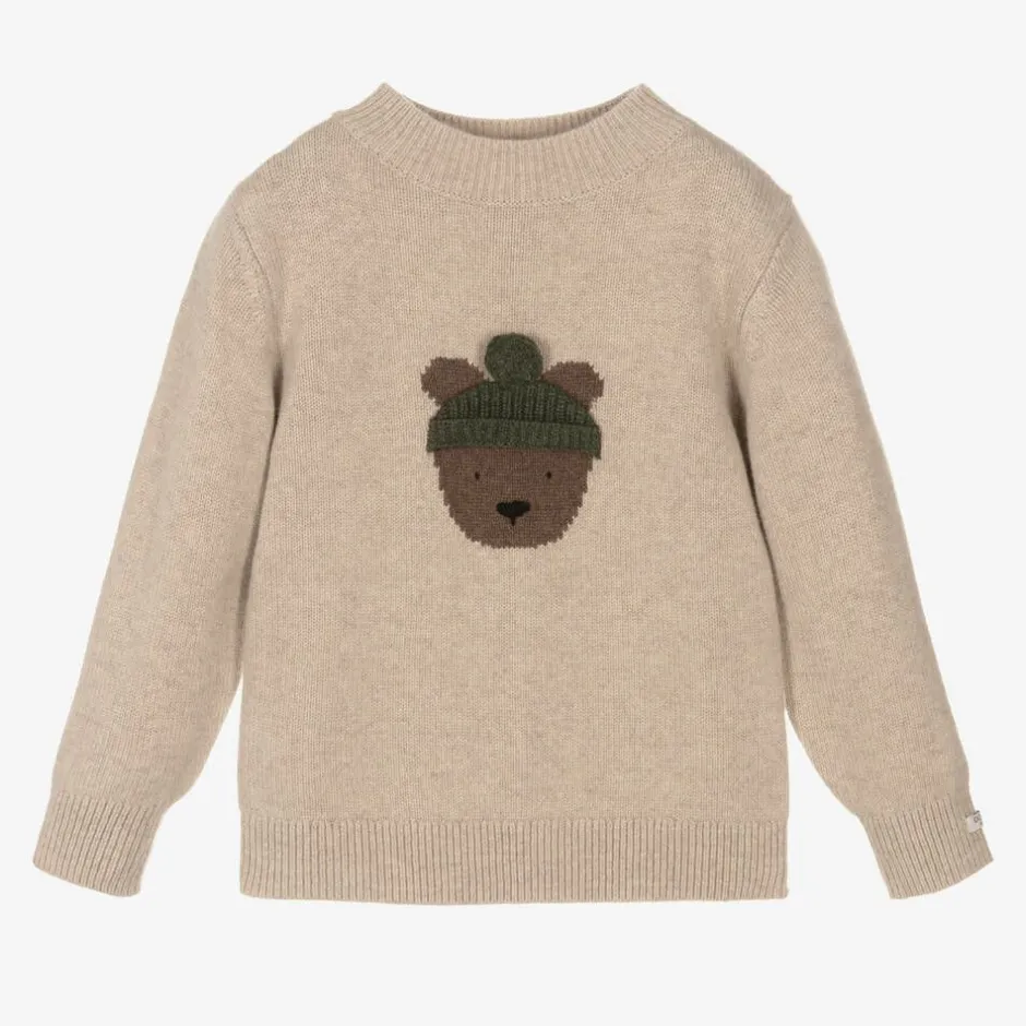 Cosy beige sweater for boys and girls by Dutch label, Donsje. Luxuriously knitted in Merino wool, this warm layering piece has an intarsia teddy bear on the front wearing a cute 3D bobble hat. The designer's logo is stitched on one cuff, signing off the look with a subtly branded touch.
