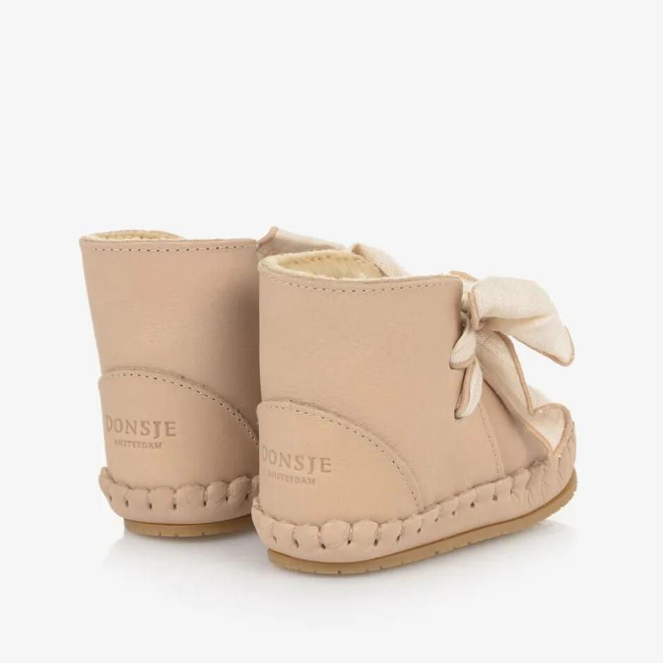 In a lovely shade of warm beige, these pre-walker boots for baby girls are from Dutch brand Donsje. Beautifully handmade in smooth leather, these cute shoes have ribbon ties on the front that fasten into a pretty bow. They are lined in soft faux fur for comfort and warmth and have an embossed logo on the back of the heel for designer appeal. Smaller sizes have a suede leather outer sole, whilst the larger sizes have a flexible rubber sole, ideal for taking those first steps.
