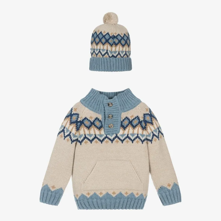 Beige and blue sweater and hat set for younger boys from Dr. Kid, knitted in a soft cotton blend. Lovely for those colder days, the cosy sweater has a charming Fair Isle pattern in blue and beige and stretchy ribbed trims. For extra warmth, it has a high neckline with branded button fastenings and to complete the casual look, there is a front pouch pocket. It comes with a matching bobble hat.